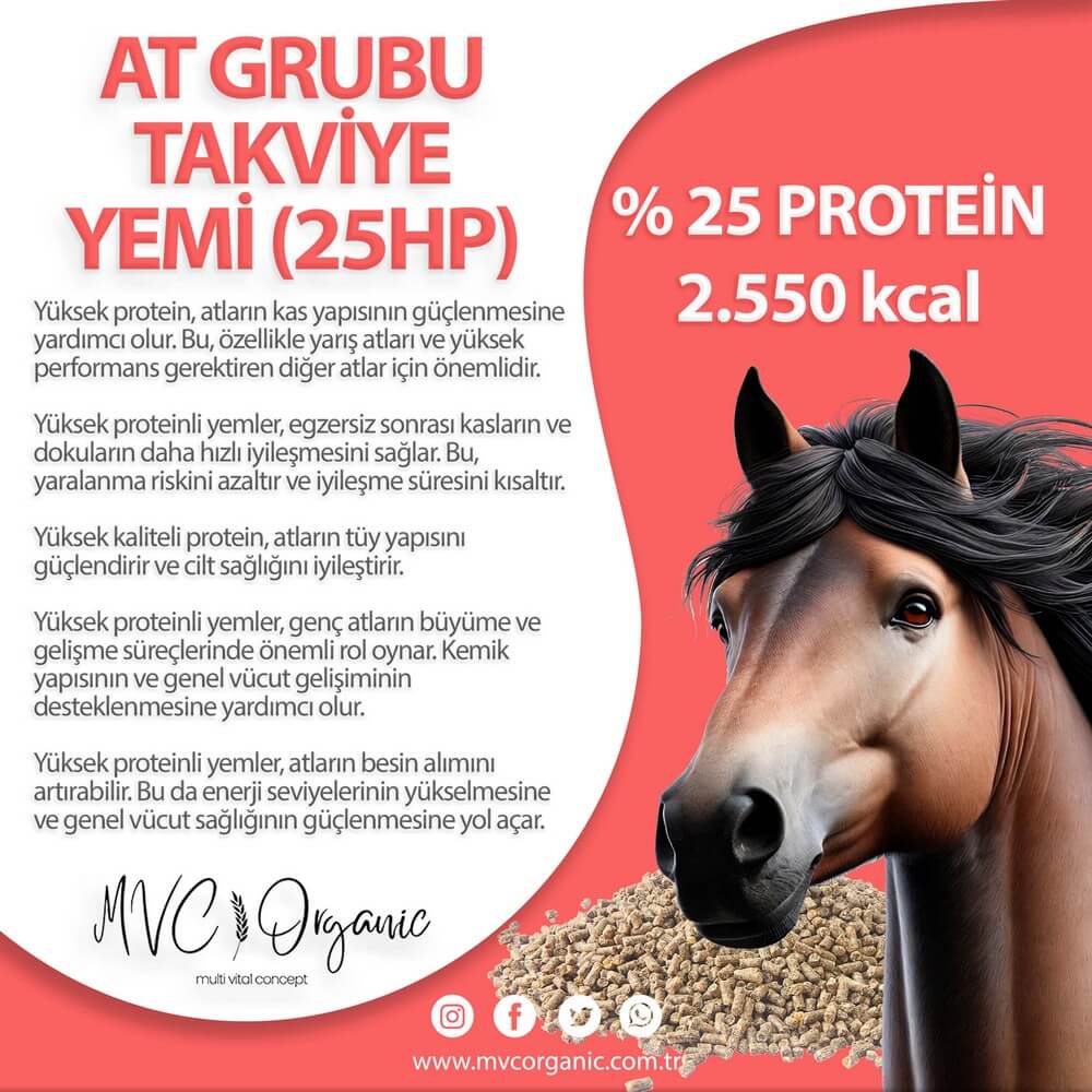 25% Protein – 2.550 Enerji: Yüksek performanslı atlar için mükemmel bir yemdir. Kas gelişimi, onarımı ve hızlı toparlanma sağlanırken, enerjik ve güçlü bir vücut yapısı oluşturur. Ancak aşırı protein ve enerji alımı, dengeli bir şekilde kontrol edilmelidir.